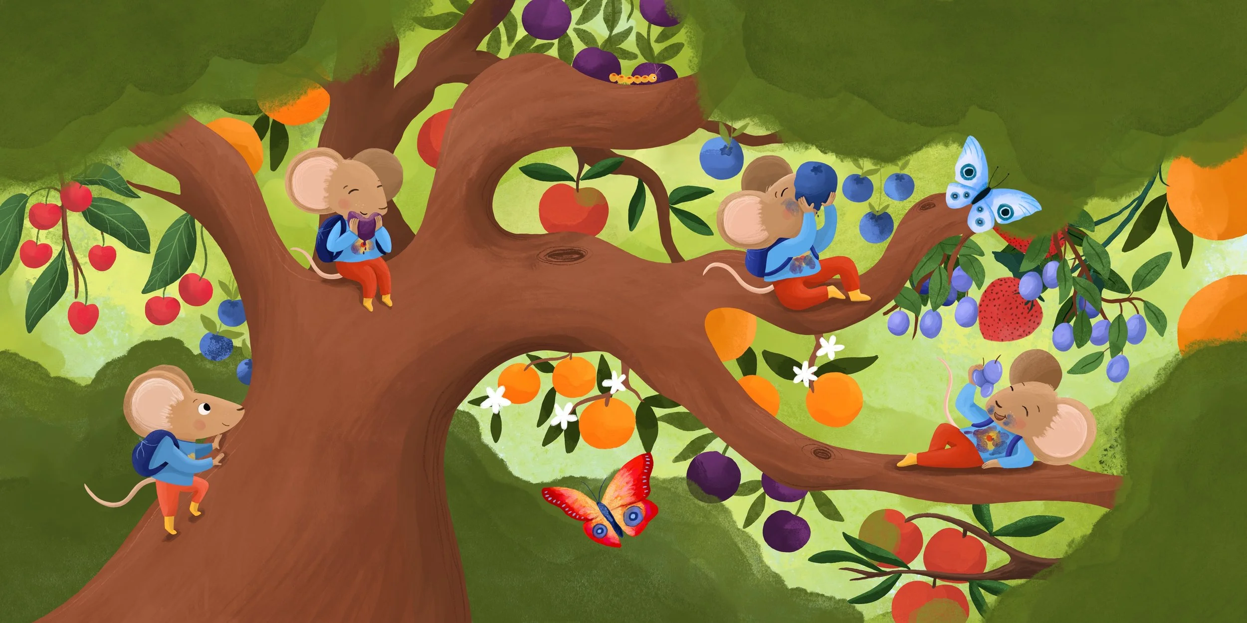 Teeny Mouse has spotted the most tasty, juicy, fruitiest tree, but it's a long, long way away, and she'll never make it there on her own...
